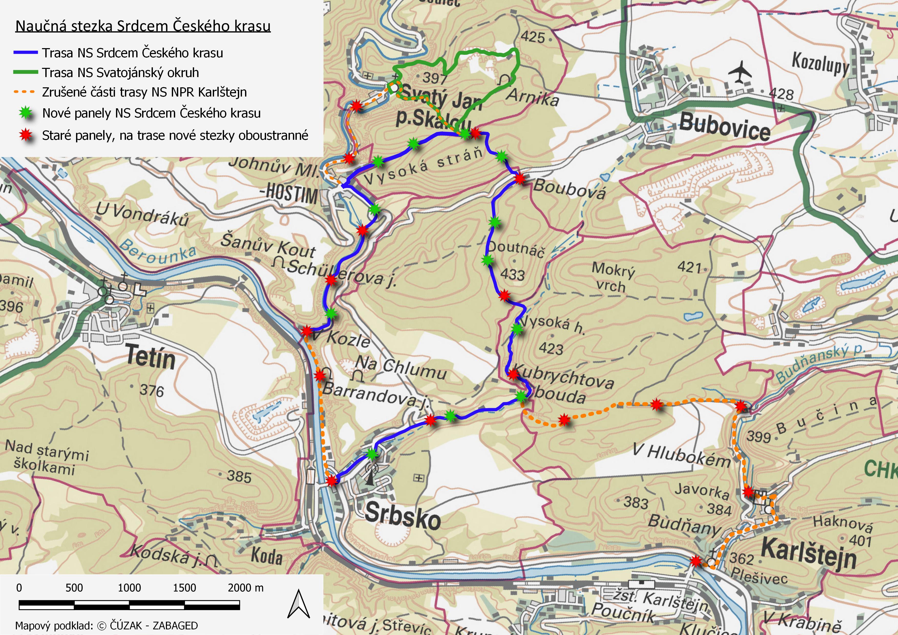 Původní informační tabule (NS NPR Karlštejn) jsou umístěné na zadní straně panelů. Návštěvníci tak mají jedinečnou příležitost nejen porovnat styl obou naučných stezek, ale také se obdivovat nestárnoucím kresbám rostlin, živočichů i geologických útvarů výtvarníka Dalibora Němce.