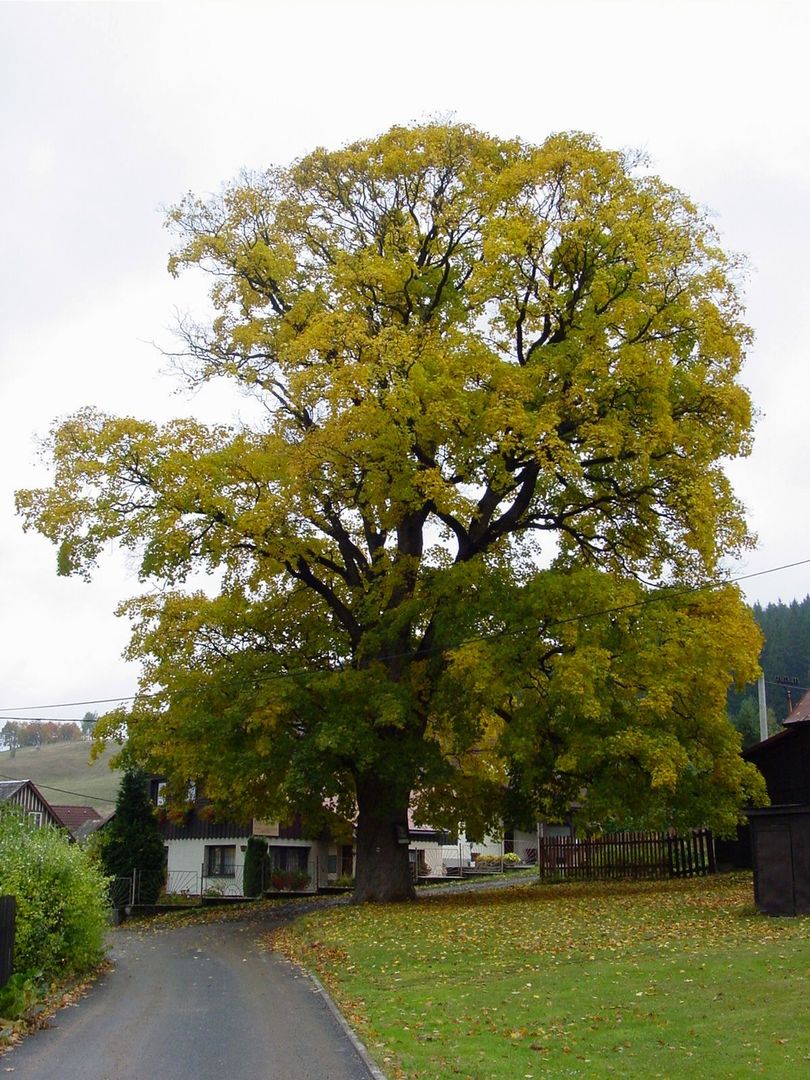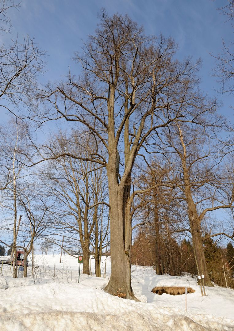 Mohutný jedinec se svalovitě stočeným kmenem, u č.p. 12 v horní část obce
