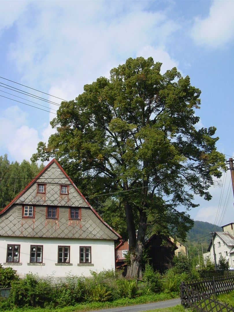 Nejmohutnější dub Jizerských hor s kulovitou korunou, roste u domu č.p. 145 u cesty na Příchovice