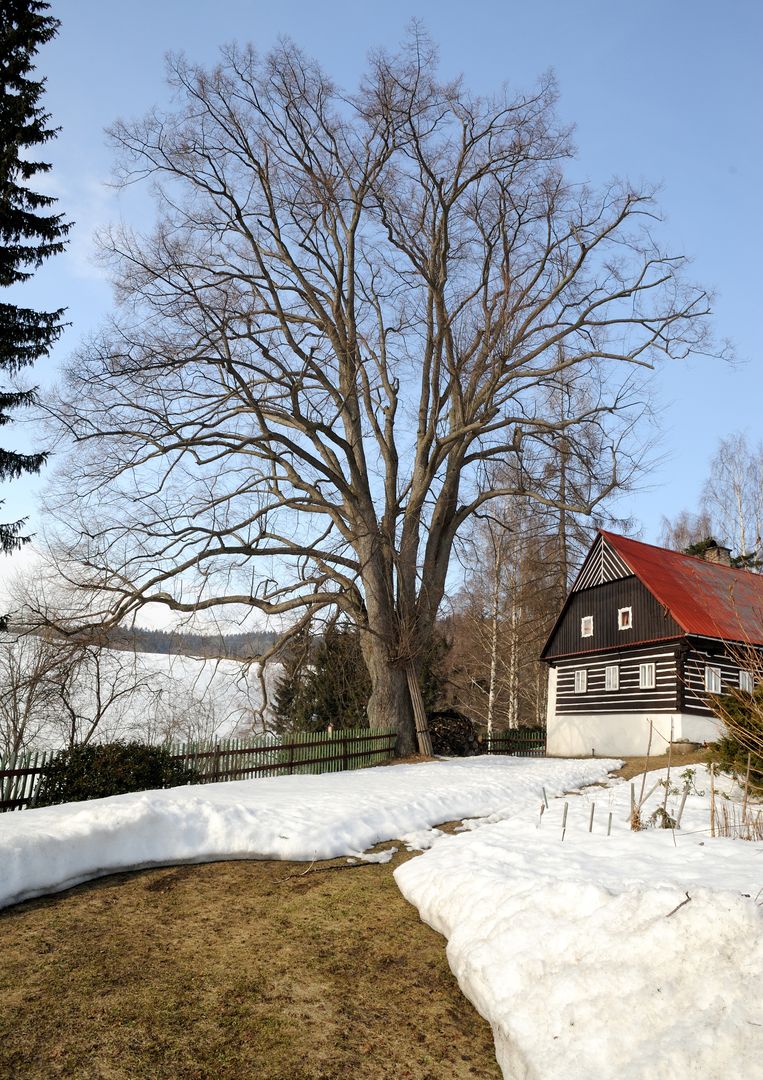 Mohutný javor s částečně redukovanou korunou v Horním Polubném při odbočce na Jizerku, naproti hotelu Sport