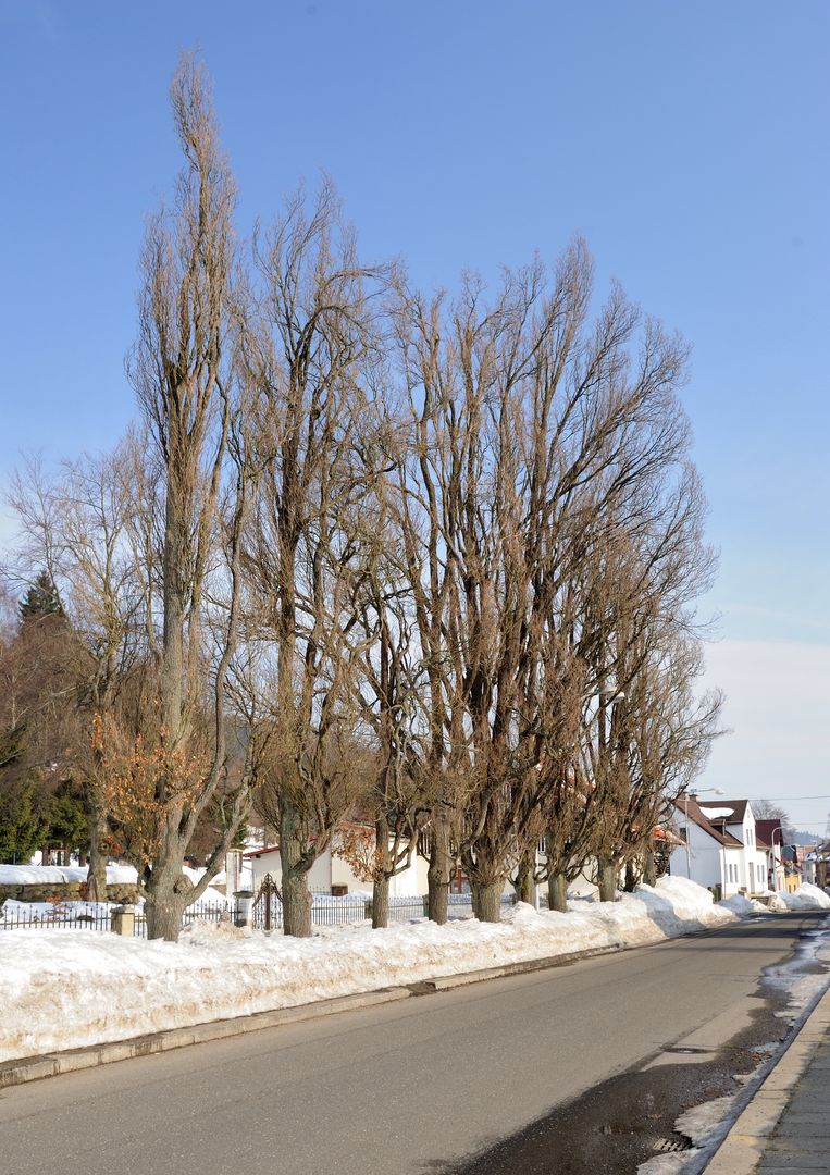 Jednostranná příuliční alej 10ti pyramidálních dubů v centru obce u hlavní ulice